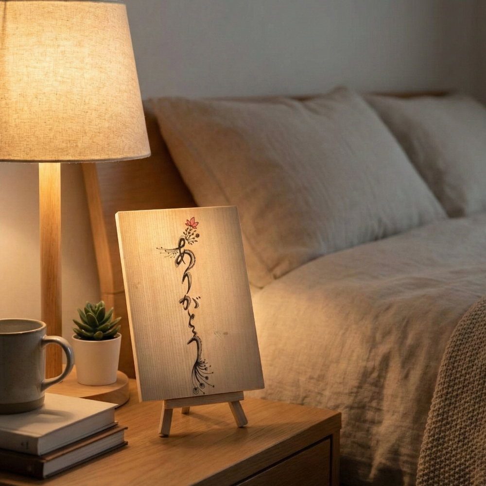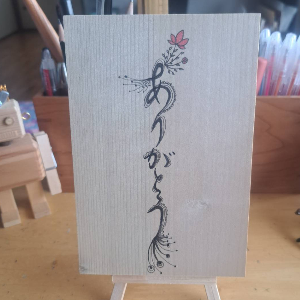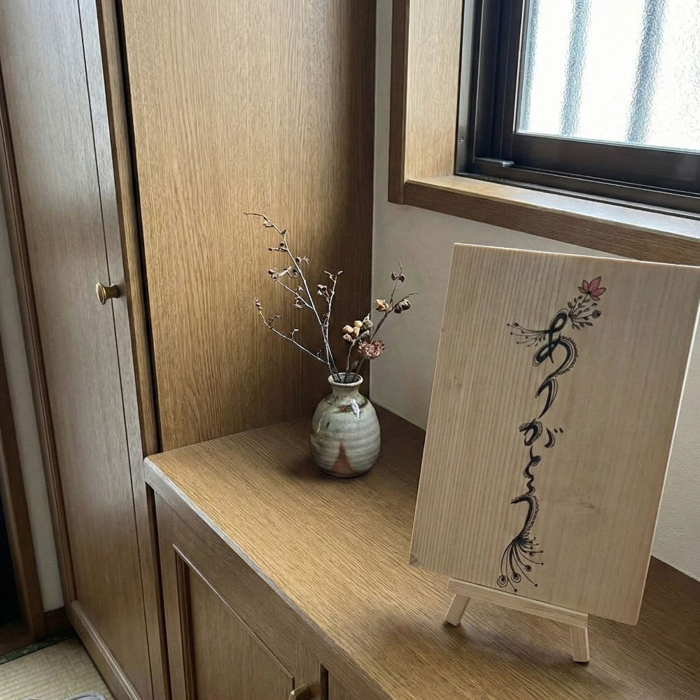目にした瞬間、胸の奥がやわらぐ。声に出さなくても、そこに在るだけで想いが伝わる。空間の空気をそっと整える、「ありがとう」を刻んだ一点物です。